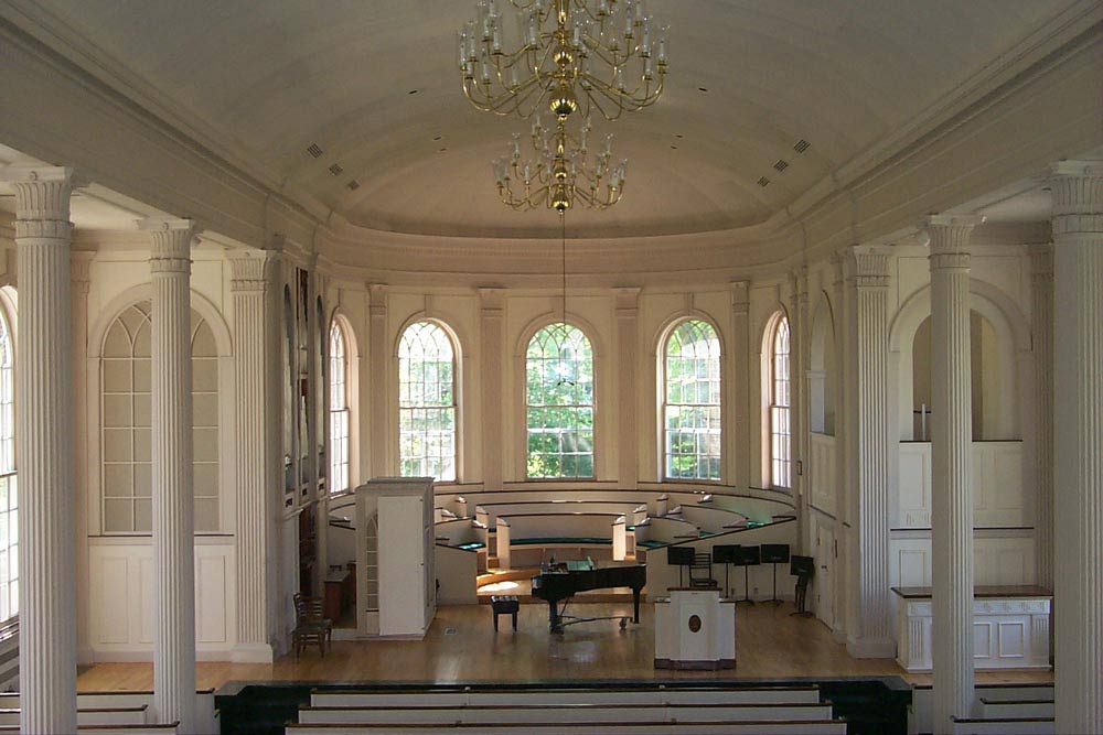 Stetson Chapel stands in the center of campus at the top of the College’s “fair Arcadian hill,” boasting a commanding view of the College’s main quadrangle and the city of Kalamazoo. Georgian style chapel built in 1931. The Chapel has two aisles separating pews with windows on both the north and south sides of the chapel and a long chancel bounded by a semi-circular bank of windows that provide ample natural lighting and reveal graceful views of the campus and beyond. The chapel holds 550 in the chapel pews (including a balcony).